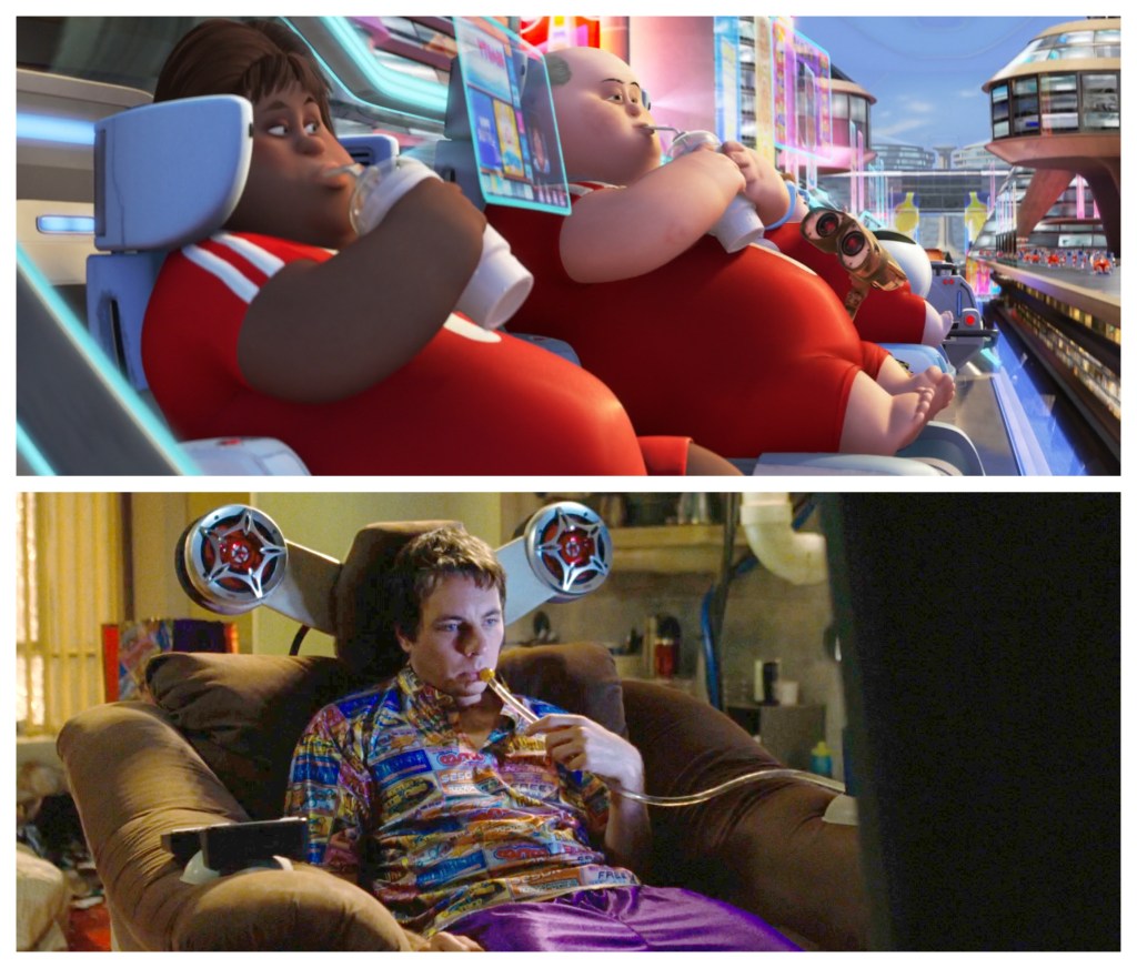 The humans themselves live in comfy chairs with built-in speaker systems, drinking through a straw.