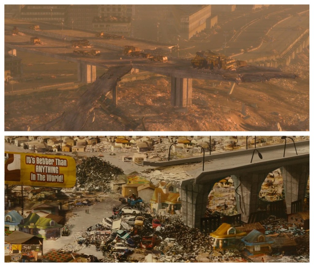 You may be surprised to discover that WALL·E and Idiocracy are, in fact, the same damn movie. (In the screenshots below, WALL·E is at the top, and Idiocracy is at the bottom. Although it might be hard to tell, because they are the same damn movie.)